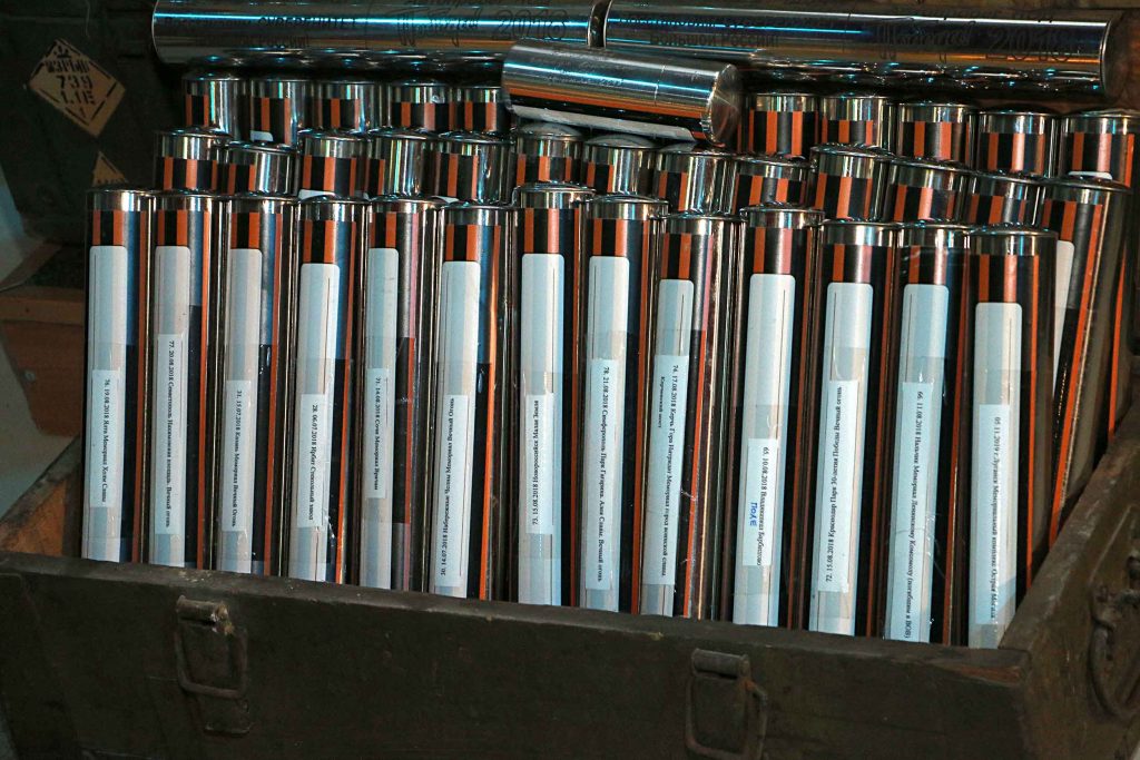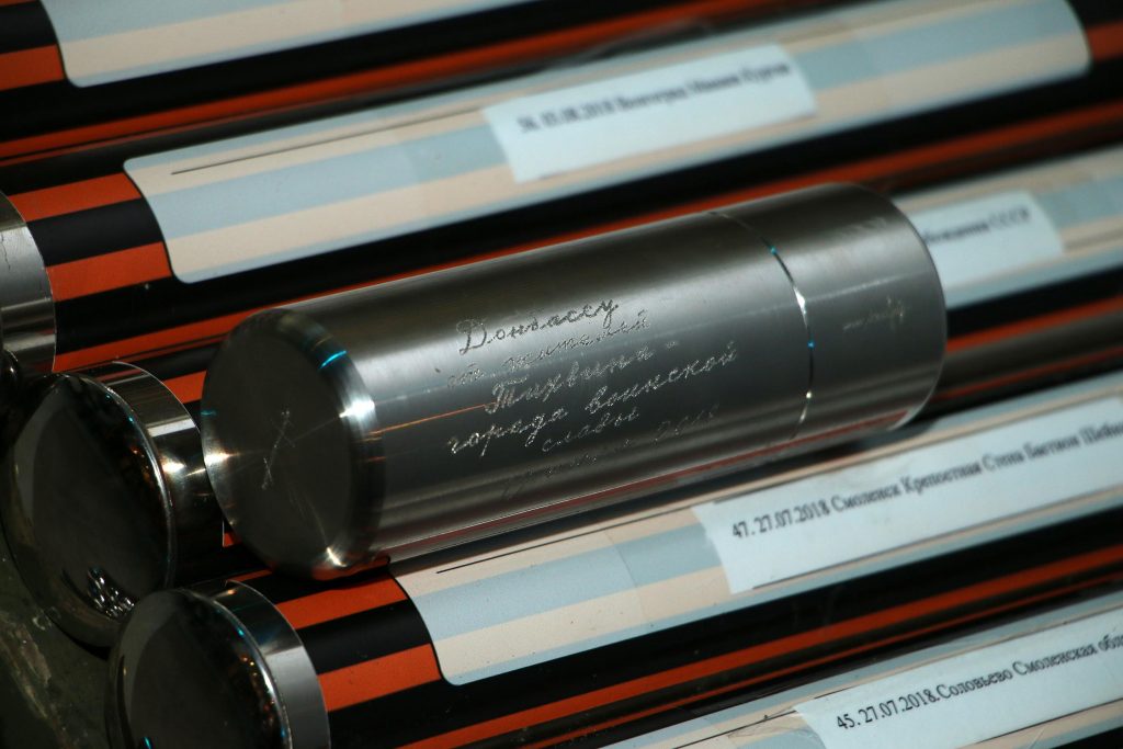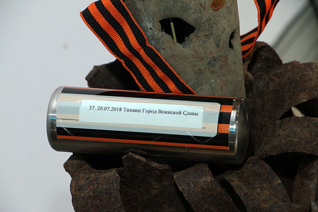 На каждой из капсул прикреплена Георгиевская лента — как символ воинской доблести и написано, из какого места она привезена, — из Керчи, Тихвина, Батайска, Орла, Курска, Махачкалы, Смоленска, Волоколамска, Астрахани, Белгорода, Калуги, Тулы и др.