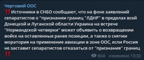 Политолог явно переоценивает умственные способности бандерлогов. Там - истерика вкупе с воинственной риторикой. УкроСМИ сообщают, что киевские дипломаты готовят ноту протеста (кому?), а Владимир Зеленский "запросил у Франции телефонного разговора с президентом Макроном". Укропский Telegram-канал "Дежурный ООС", ссылаясь на источники в Совете национальной безопасности и обороны Украины, пишет о новых требованиях к Москве (и даже угрозах), с которыми провинциальный еврейский комик Зеля отправится на встречу в нормандском формате.