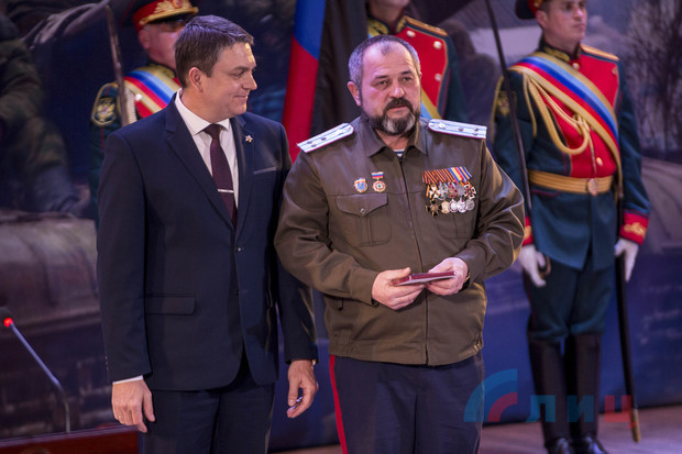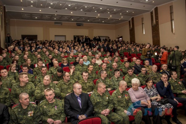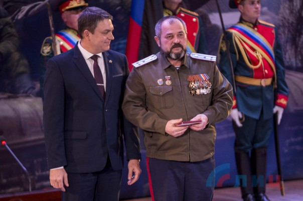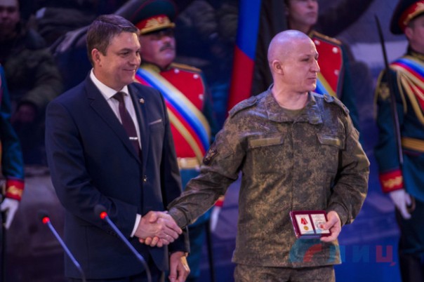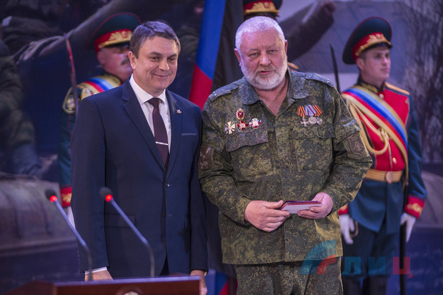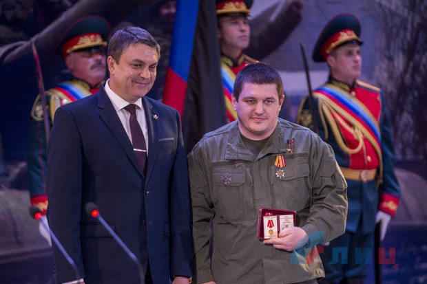 Глава ЛНР Леонид Пасечник в ходе торжественного собрания в Луганской академической филармонии, посвященного пятилетию освобождения Дебальцево, вручил медали участникам Дебальцевско-Чернухинской операции.