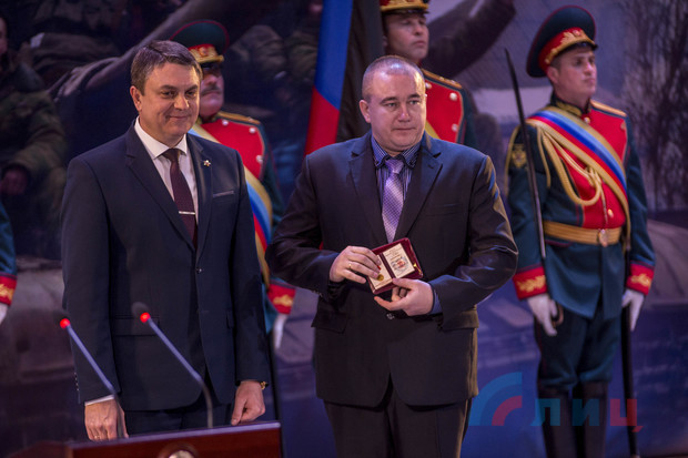 Глава ЛНР в ходе торжественного собрания в Луганской академической филармонии, посвященного пятилетию завершения Дебальцевско-Чернухинской операции, вручил медали родным павших защитников за оборону Республики и освобождение Дебальцево.
