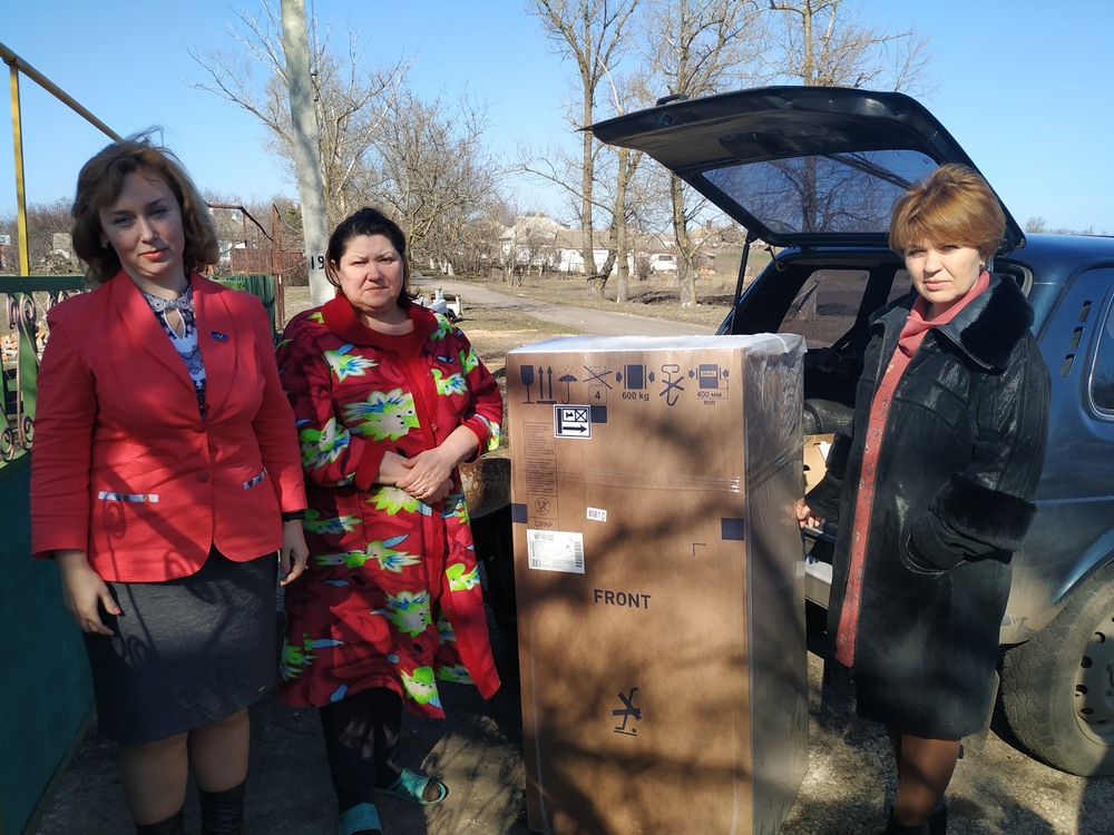 В Саханку переселенке из Коминтерново, чей дом пострадал от снарядов ВСУ, общественники привезли новый холодильник.