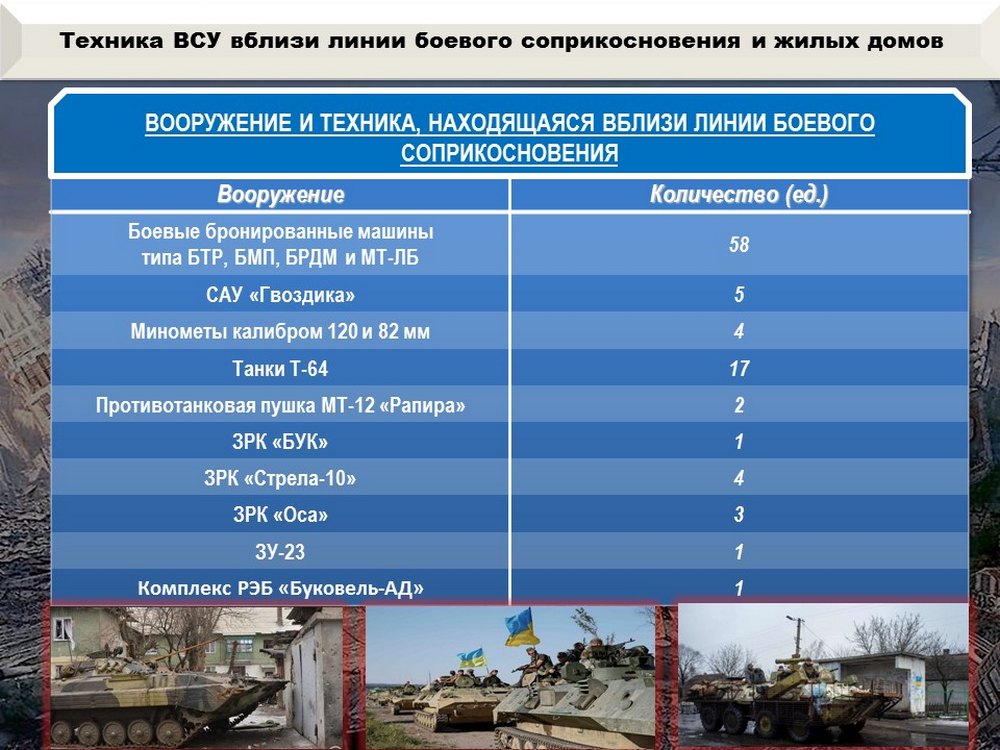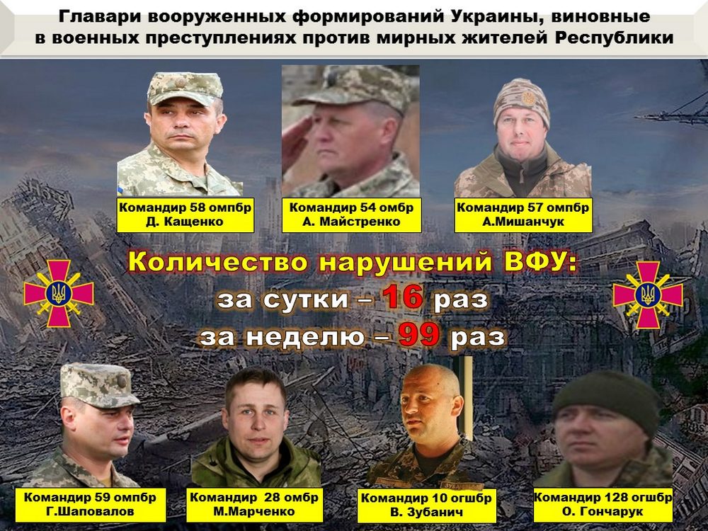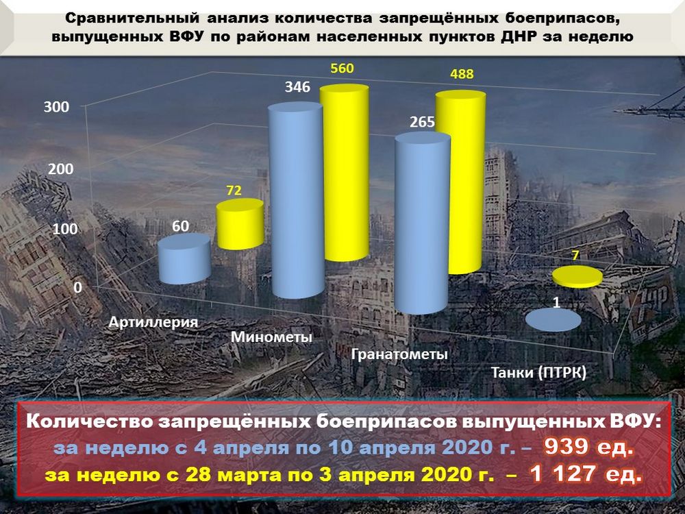 «По районам двадцати шести населенных пунктов Республики противник выпустил более 900 боеприпасов, в том числе шестьдесят 122-мм артиллерийских снарядов и триста сорок шесть мин калибра 120 и 82 мм.