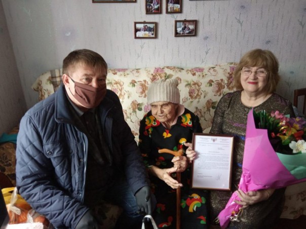 Юрий Будрин передал имениннице поздравительный адрес от Главы Донецкой Народной Республики Дениса Пушилина, а также вручил юбиляру цветы и продуктовый набор.