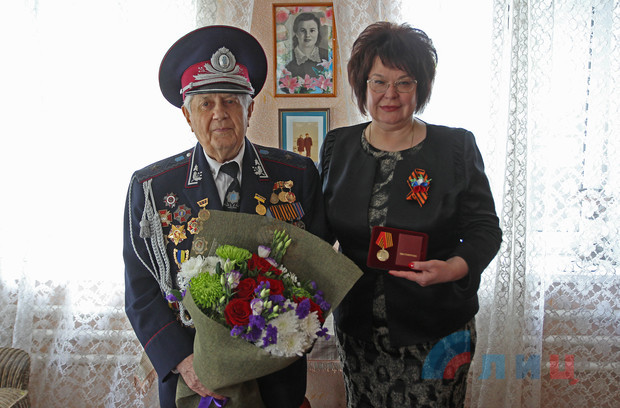 Советник главы ЛНР вручила кавалеру ордена Славы Горшколепову медаль "75 лет Победы"