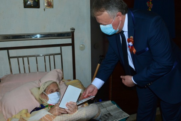 Советник главы Республики Марина Филиппова в преддверии 9 Мая посетила на дому ветерана Великой Отечественной войны, полного кавалера ордена Славы Ивана Горшколепова и вручила ему юбилейную медаль "75 лет Победы".