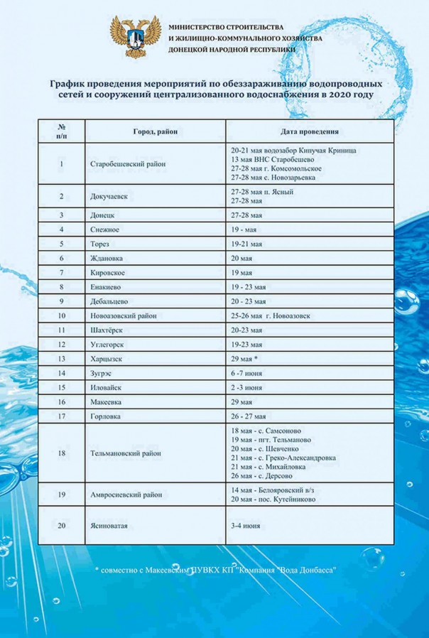 «С сегодняшнего дня в Республике начались мероприятия по дезинфекции водопроводных сетей с использованием хлора. Первым населённым пунктом, в котором началось хлорирование воды, стал посёлок Старобешево. Из-за остановки водопроводной насосной станции временно приостановлено централизованное водоснабжение. Завершение данных работ и возобновление подачи воды запланировано к концу дня», – рассказал Владимир Дубовка.