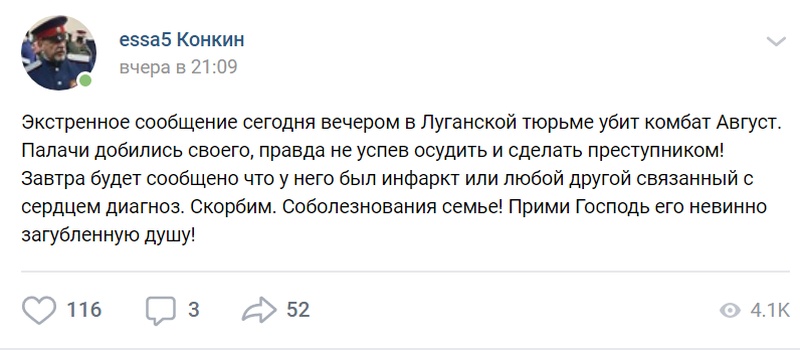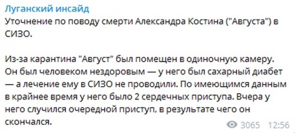 Завтра наступило. «Об обстоятельствах произошедшего мне ничего не известно, однако, как мне сообщают, сегодня в СИЗО по указанному адресу приехала проверка, сейчас там идет «разбор полетов», - сообщает Т-канал «Луганский инсайд» 25 мая. На этом же Т-канале опубликована следующая информация: «Из-за карантина «Август» был помещен в одиночную камеру. Он был человеком нездоровым, у него был сахарный диабет, а лечение ему в СИЗО не проводили. По имеющимся данным, в крайнее время у него было два сердечных приступа. Вчера у него случился очередной приступ, в результате чего он скончался».