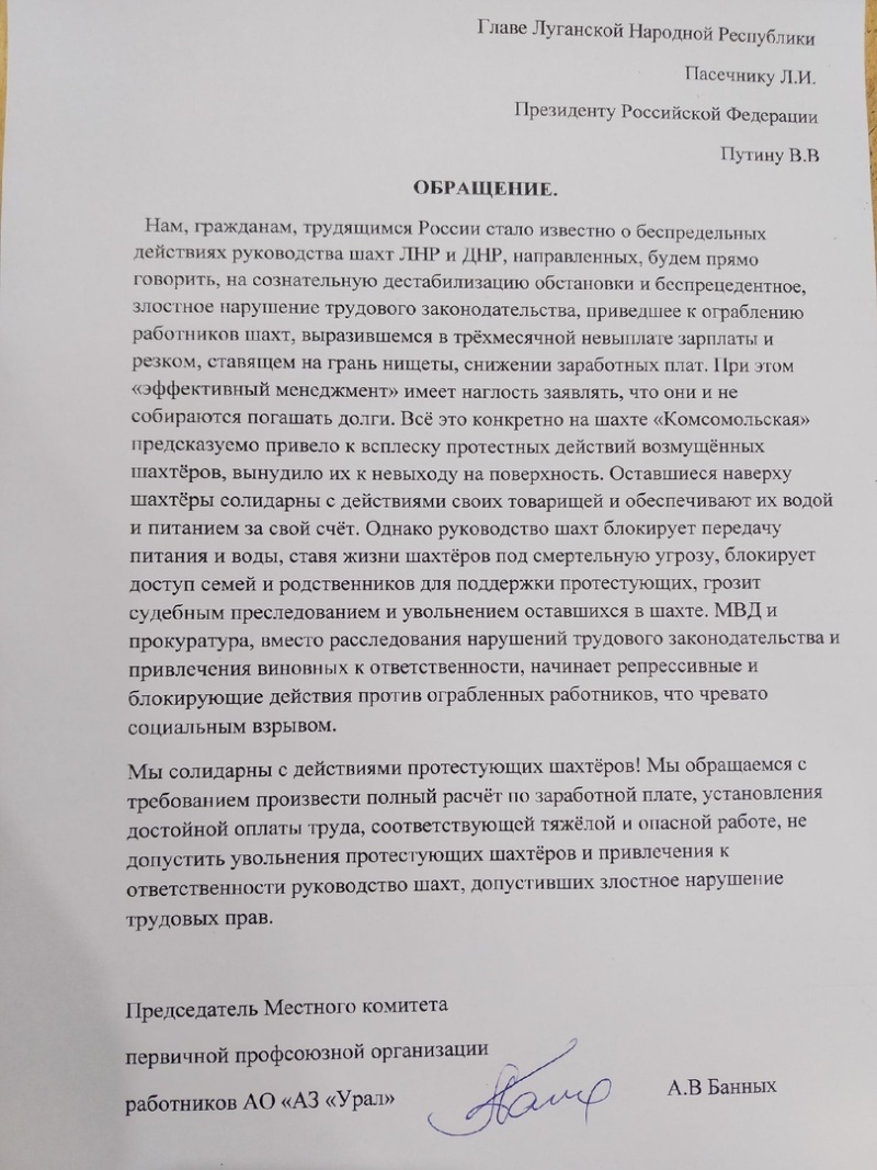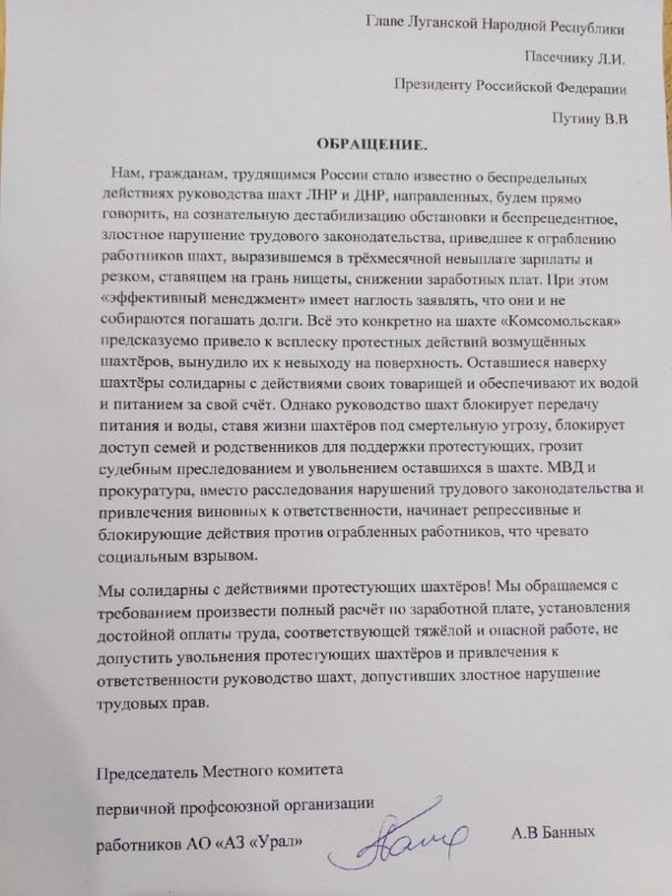 Шахтёры Комсомольской в ЛНР перешли к голодовке и обращаются к Путину