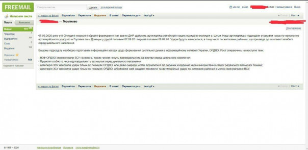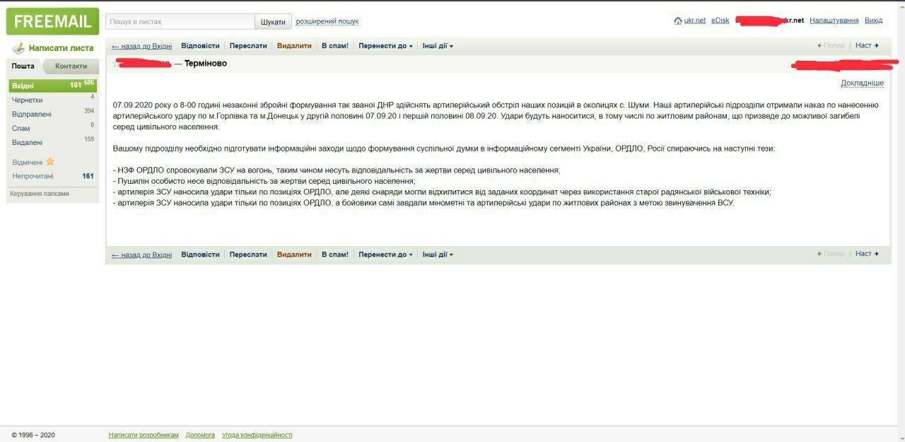 Вашему подразделению необходимо подготовить информационные мероприятия по формированию общественного мнения Украины, ОРДЛО, России основываясь на следующие тезисы: — НВФ ОРДЛО спровоцировали ВСУ на ответный огонь, а значит, несут ответственность за жертвы среди гражданского населения; — Пушилин лично несёт ответственность за жертвы среди гражданского населения; — артиллерия ВСУ наносила удары только по позициям ОРДЛО, но некоторые снаряды могли отклонится от заданных координат из-за использования старой советской военной техники; — артиллерия ВСУ наносила удары только по позициям ОРДЛО, а боевики сами нанесли миномётные и артиллерийские удары по жилым районам с целью обвинения ВСУ», — говорится в перехваченном сообщении 72-ого центра информационно-психологических операций.