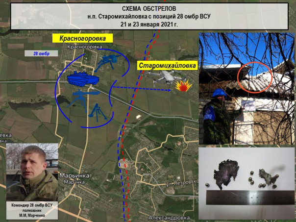 21 января, несмотря на заседание Контактной группы и нахождения в зоне ООС председателя СММ ОБСЕ Анн Линде, боевики 3 механизированного батальона 28-й бригады ВФУ применили 120-мм минометы, выпустив три мины, 15 гранат из АГС и три гранаты из СПГ по району н.п. Старомихайловка, зафиксировано 20 выстрелов из БМП-2. В результате обстрела повреждены три жилых дома.