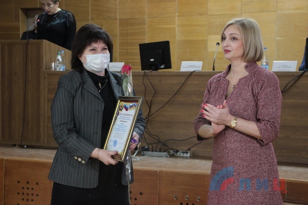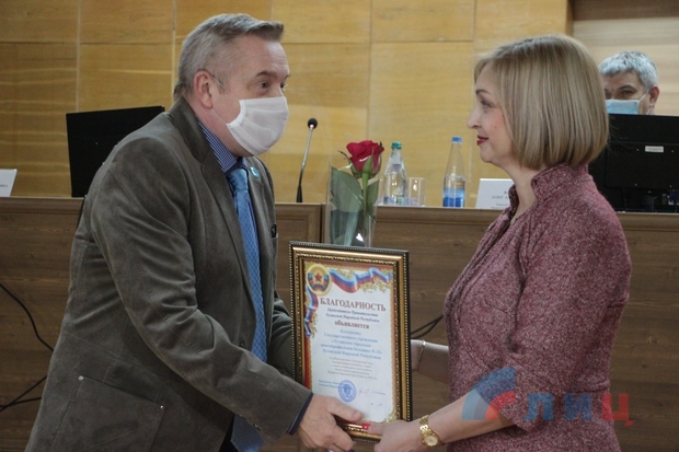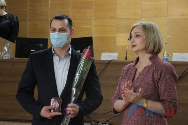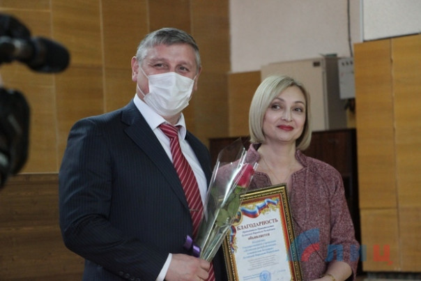 Она вручила ведомственные нагрудные знаки "За спасение жизни" и почетные грамоты Минздрава лучшим медикам ЛНР, а отличившиеся коллективы учреждений здравоохранения были отмечены благодарностями Правительства Республики.