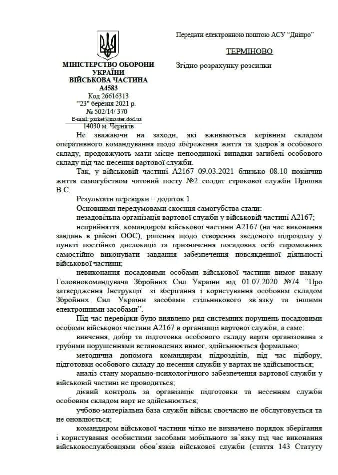 9 марта, солдатик 72-ой отдельной механизированной бригады имени Чёрных запорожцев, Пришва Виталий Сергеевич, также решил сбежать из этого мира и застрелился, находясь в карауле. Мои шпионы добыли полный комплект документов по этому факту, в том числе и результаты служебной проверки, которые будут постом ниже.