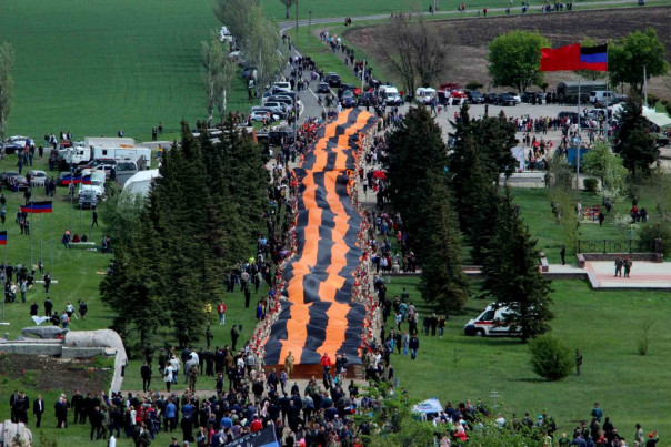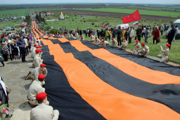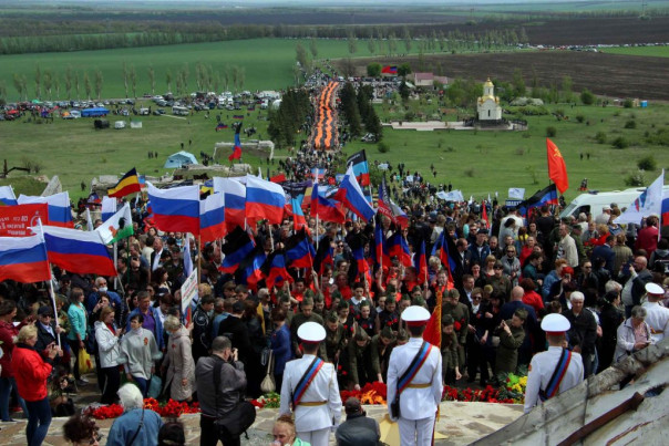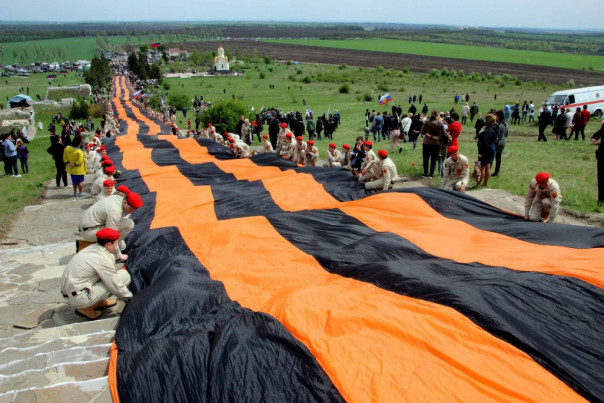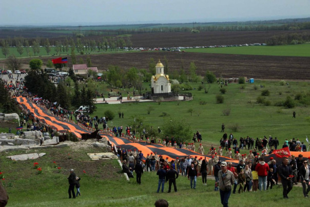 Сегодня, 8 мая, в ходе торжественных мероприятий, посвященных 76-й годовщине Победы в Великой Отечественной войне, на легендарной высоте Саур-Могила была развернута самая большая в мире Георгиевская лента. Она была доставлена сюда общественниками из Российской Федерации вместе с частицей Вечного огня с Мамаева кургана в Волгограде.