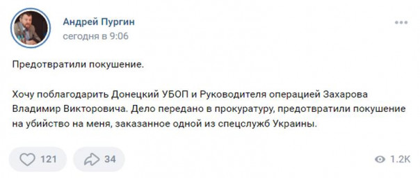 В Донецке предотвращено покушение на основателя ДНР Андрея Пургина. Об этом политик написал на своей странице в социальной сети.