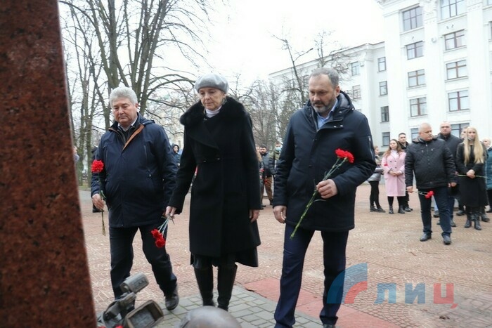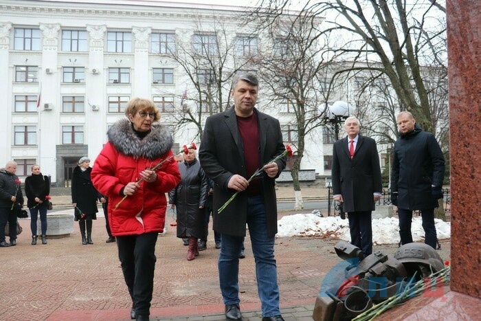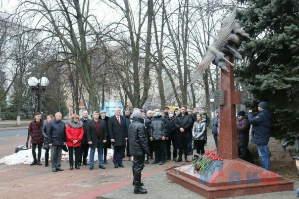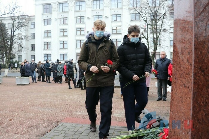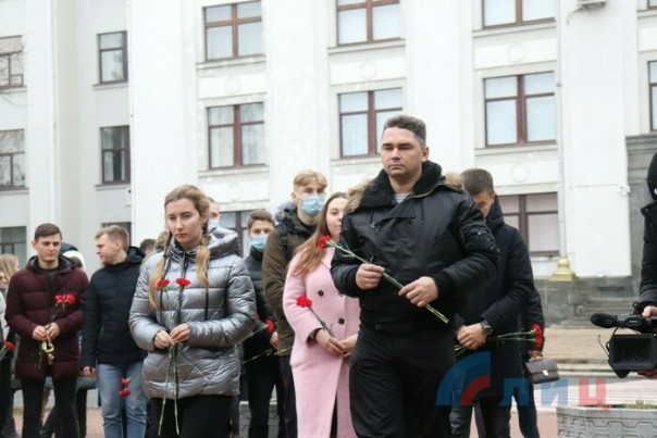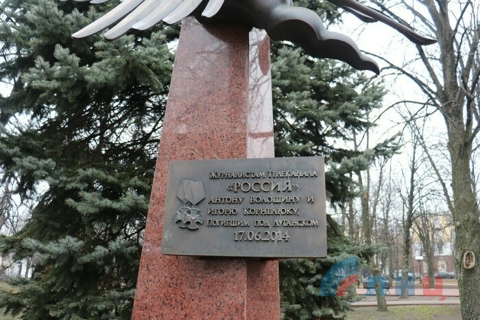 Жители Луганска возложили цветы к установленному у Дома правительства Республики памятному знаку в честь журналистов, погибших при освещении событий в Донбассе.