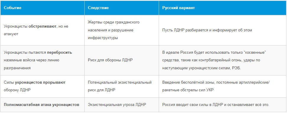 Когда Россия вмешается, это будет иметь реальные негативные экономические и политические последствия. Таким образом, для Путина и правительства жизненно важно создать такую политическую динамику внутри России, чтобы российский народ не только поддержал интервенцию, но И ПОТРЕБОВАЛ её. Тогда, когда западные “санкции из ада” будут введены, люди не будут обвинять Путина в очень реальной цене, которую России придётся заплатить, чтобы одержать победу.