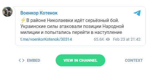 «В районе Николаевки идёт серьёзный бой. Украинские силы атаковали позиции Народной милиции и попытались перейти в наступление», – сообщил у себя в телеграме Котенок.