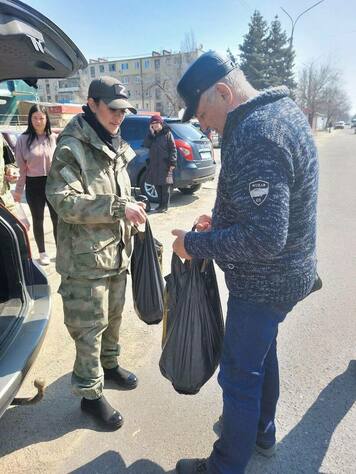 Работники Генпрокуратуры передали горожанам продукты – крупы, макаронные изделия, масло, сахар, консервы, соки, а также сладости для детей.