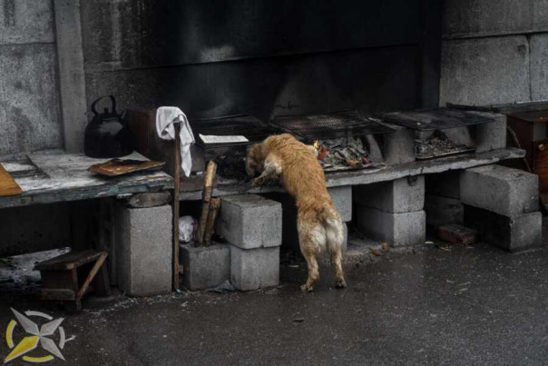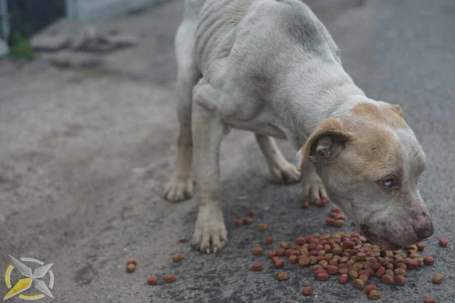 Пока раздавали помощь, под ногами болтались собаки и кошки. Здесь их было много. Животные прибиваются к людям, чтобы выжить. Среди всех выделялась одна собака. Породистая, с красивыми необычными глазами. Будто пёс был слепой, но он хорошо ориентировался в пространстве, потому сомнений не было в том, что он всё видит. Но не глазами он выделялся, а своей худобой. Рёбра буквально торчали. Кожа обтянула скелет. Казалось, что внутренностей вообще не было.