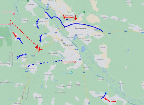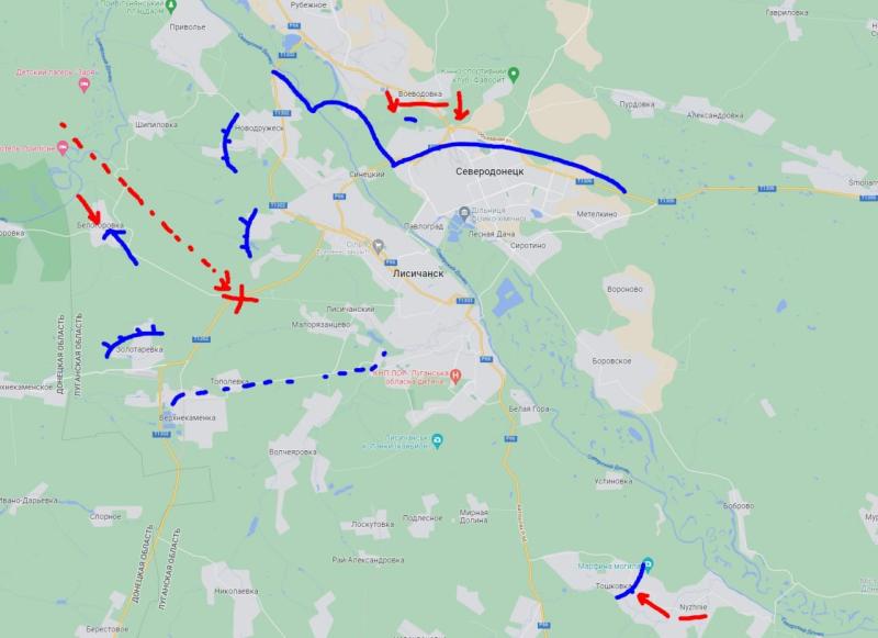 Участок между Верхнекаменкой и Лисичанском находится под обстрелом. Соответственно, при укреплении огневого контроля над этой дорогой, Северодонецкая группировка ВСУ окажется в условиях оперативного окружения. ВСУ придётся переключать снабжение на второстепенную дорогу Верхнекаменка-Лисичанск через Тополёвку.