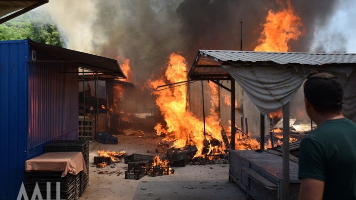 Несколько торговых точек полностью уничтожены, повреждены около 10 жилых домов.. На месте вспыхнувшего после взрыва пожара работают расчеты МЧС ДНР.