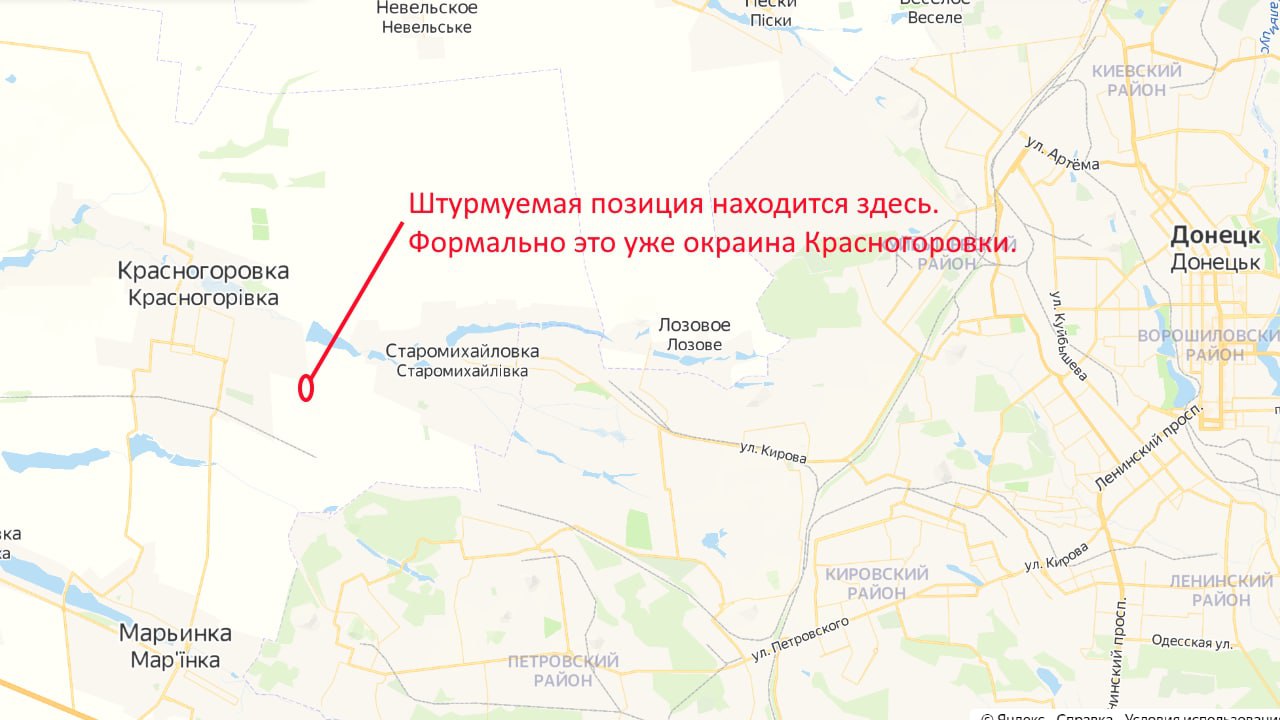 И кстати, точка штурма (обозначена на карте), это уже формально территория н.п. Красногоровка (хотя до первой полуразбитой хаты еще надо пройти около 400 метров), за окраины которой, судя по этому видео, 100-я бригада НМ ДНР и закрепилась. Источник