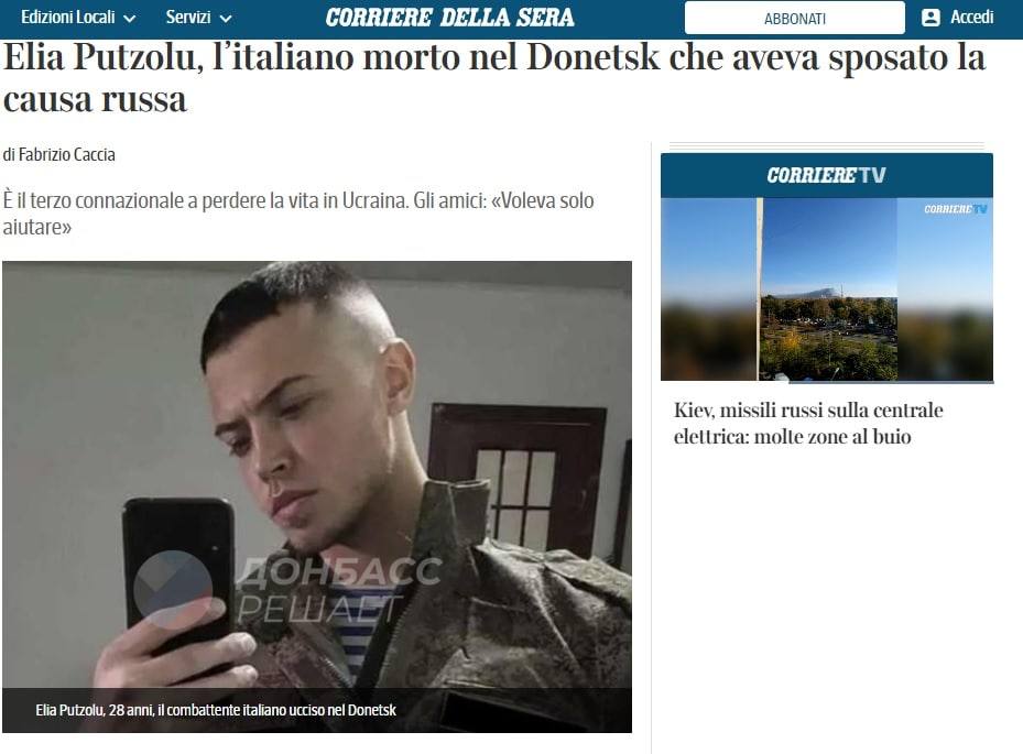 "С таким настроением он ушел, записался в Донецкое народное ополчение, а затем в спецназ", - рассказывает итальянская газета Corriere della Sera об уроженце Сардии Элии Путцоле, погибшем в Донбассе.