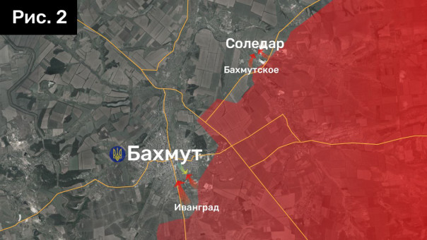 Российские войска ведут штурмовые действия на юго-восточных окраинах Соледара. Также они атакуют в районе посёлка Бахмутское. А в самом Бахмуте начались встречные бои. ЧВК «Вагнер» продолжает штурмовые действия, а украинский гарнизон пытается контратаковать. ВСУ хотят напрячь противника на восточных окраинах города, а у них проблемы со стороны Иванграда на юго-востоке. (Рис.2)