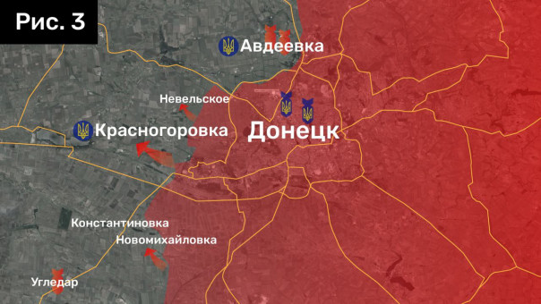 На донецком фронте российские войска бьют по укрепрайону ВСУ в Авдеевке. Украинская армия, в свою очередь, обстреливает областной центр. На земле Вооружённые Силы РФ не оставляют попыток взять Невельское. Также очередной штурм укрепрайона ВСУ в Красногоровке. Южнее российские войска пытаются атаковать у Новомихайловки. С целью выйти на Константиновку и перерезать важный участок рокады аж до Угледара. А по этому городу работала артиллерия. (Рис.3)