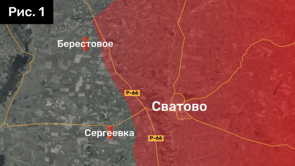 На луганском направлении украинская армия сейчас перешла к обороне. Впрочем, возможна перегруппировка. В свою очередь, российские войска не дали продвинуться ВСУ в районе Берестового. По позициям противника они ведут плотный артиллерийский огонь. Южнее они наносят удары по Сергеевке. Это вблизи главной рокады на трассе Р-66 и в непосредственной близости от одного из главных логистических центров российской армии в городе Сватово. (Рис.1)