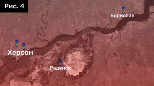 На херсонском направлении украинская армия нанесла ракетные удары по областному центру, Бериславу и Раденску. На земле успеха не имела. (Рис.4)