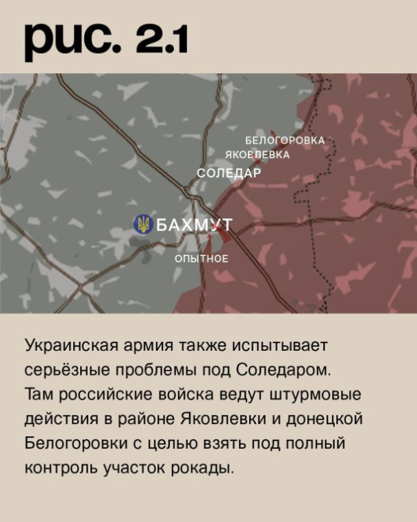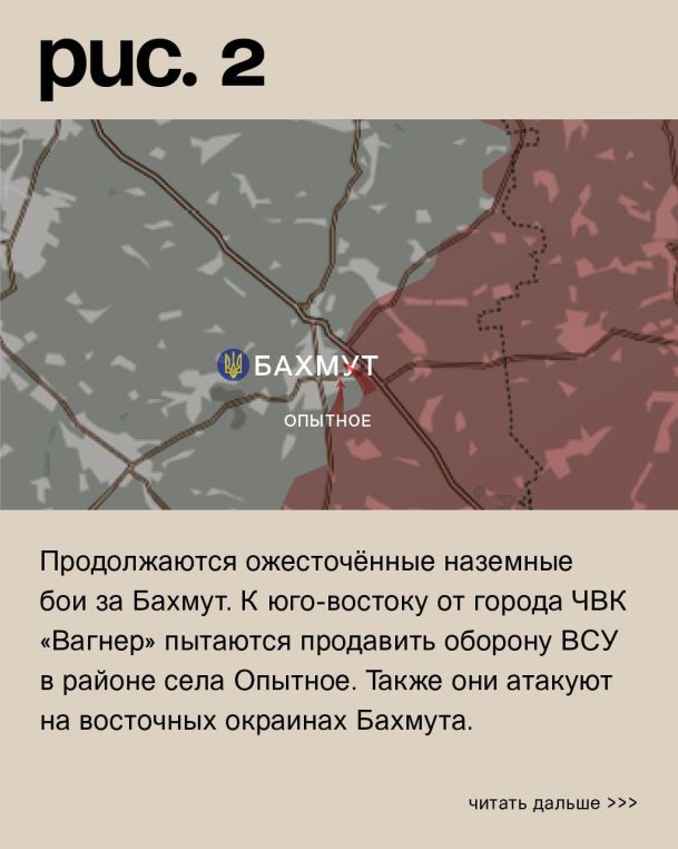 Продолжаются ожесточённые наземные бои за Бахмут. К юго-востоку от города ЧВК «Вагнер» пытаются продавить оборону ВСУ в районе села Опытное. Также они атакуют на восточных окраинах Бахмута. Украинская армия также испытывает серьёзные проблемы под Соледаром. Там российские войска ведут штурмовые действия в районе Яковлевки и донецкой Белогоровки с целью взять под полный контроль участок рокады. (Рис. 2)