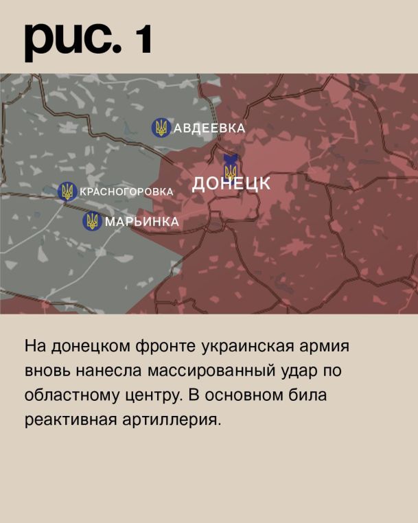 На донецком фронте украинская армия вновь нанесла массированный удар по областному центру. В основном била реактивная артиллерия. (Рис. 1)