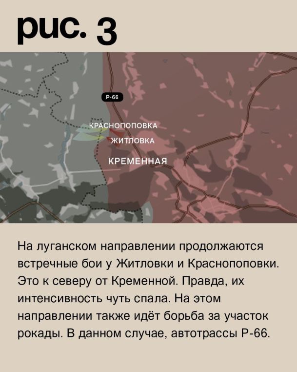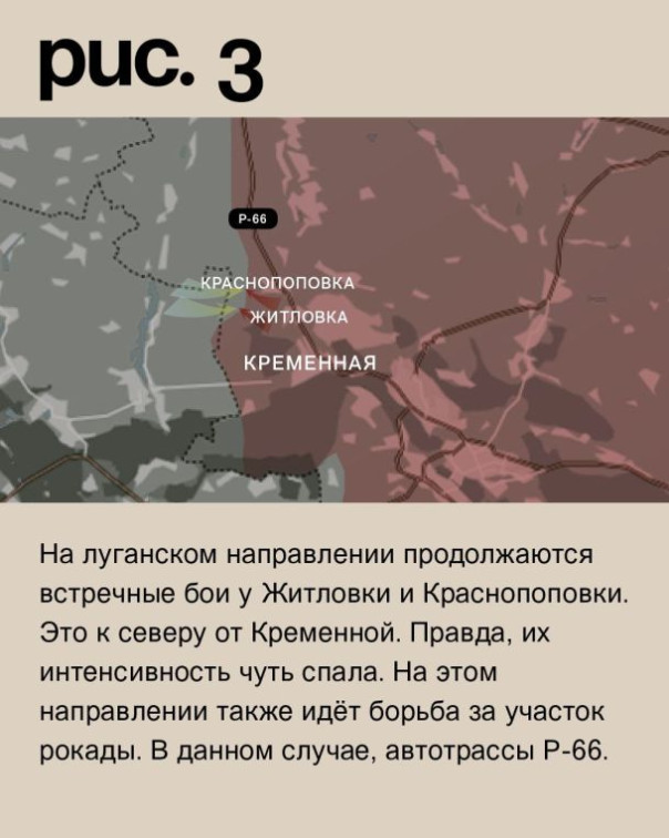 На луганском направлении продолжаются встречные бои у Житловки и Краснопоповки. Это к северу от Кременной. Правда, их интенсивность чуть спала. На этом направлении также идёт борьба за участок рокады. В данном случае, автотрассы Р-66. (Рис. 3)