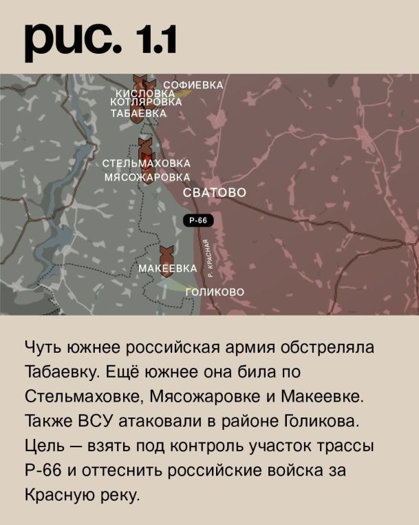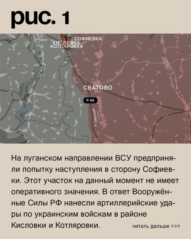 На луганском направлении ВСУ предприняли попытку наступления в сторону Софиевки. Этот участок на данный момент не имеет оперативного значения. В ответ Вооружённые Силы РФ нанесли артиллерийские удары по украинским войскам в районе Кисловки и Котляровки. Чуть южнее российская армия обстреляла Табаевку. Ещё южнее она била по Стельмаховке, Мясожаровке и Макеевке. Также ВСУ атаковали в районе Голикова. Цель – взять под контроль участок трассы Р-66 и оттеснить российские войска за Красную реку. (Рис. 1)