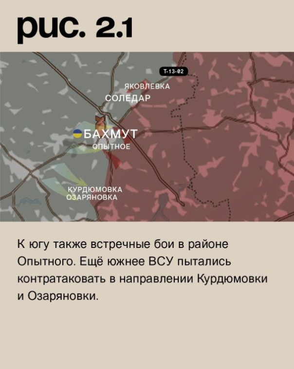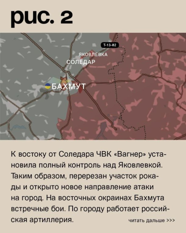 К востоку от Соледара ЧВК «Вагнер» установила полный контроль над Яковлевкой. Таким образом, перерезан участок рокады и открыто новое направление атаки на город. На восточных окраинах Бахмута встречные бои. По городу работает российская артиллерия. К югу также встречные бои в районе Опытного. Ещё южнее ВСУ пытались контратаковать в направлении Курдюмовки и Озаряновки. (Рис. 2)