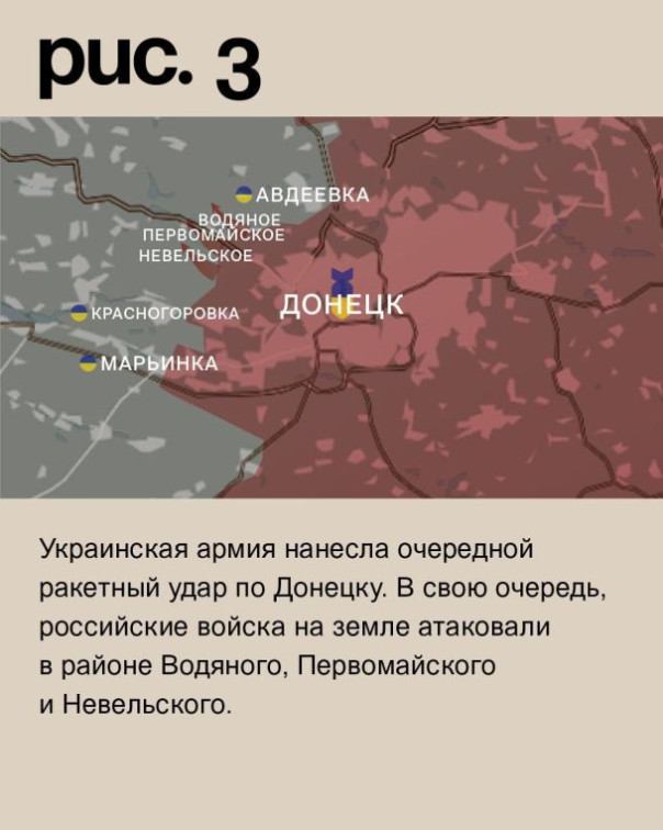 Украинская армия нанесла очередной ракетный удар по Донецку. В свою очередь, российские войска на земле атаковали в районе Водяного, Первомайского и Невельского. (Рис. 3)