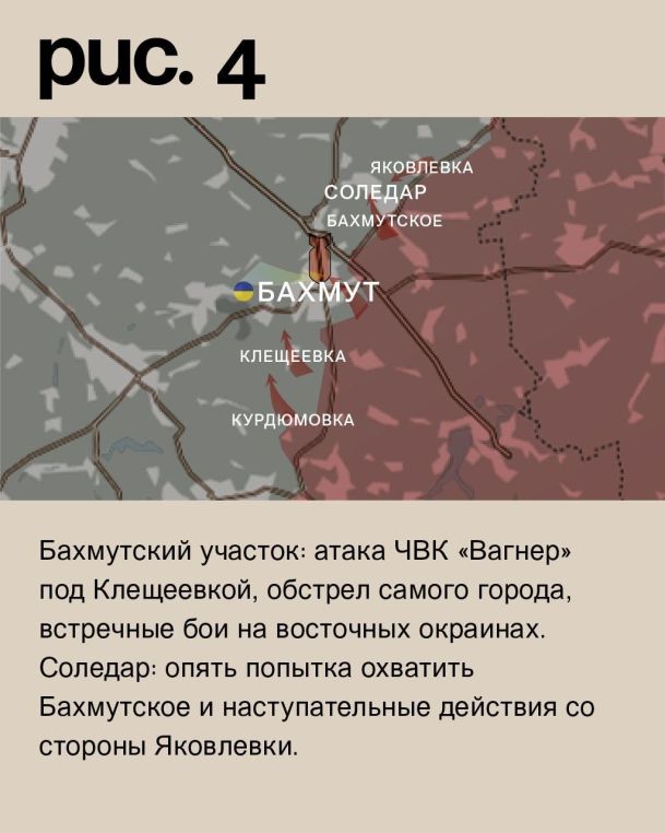 Бахмутский участок: атака ЧВК «Вагнер» под Клещеевкой, обстрел самого города, встречные бои на восточных окраинах. Соледар: опять попытка охватить Бахмутское и наступательные действия со стороны Яковлевки. (Рис. 4)