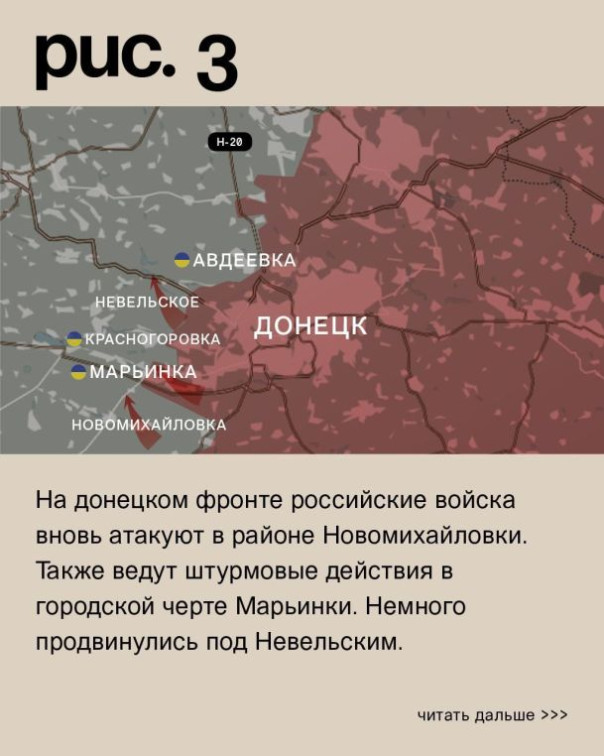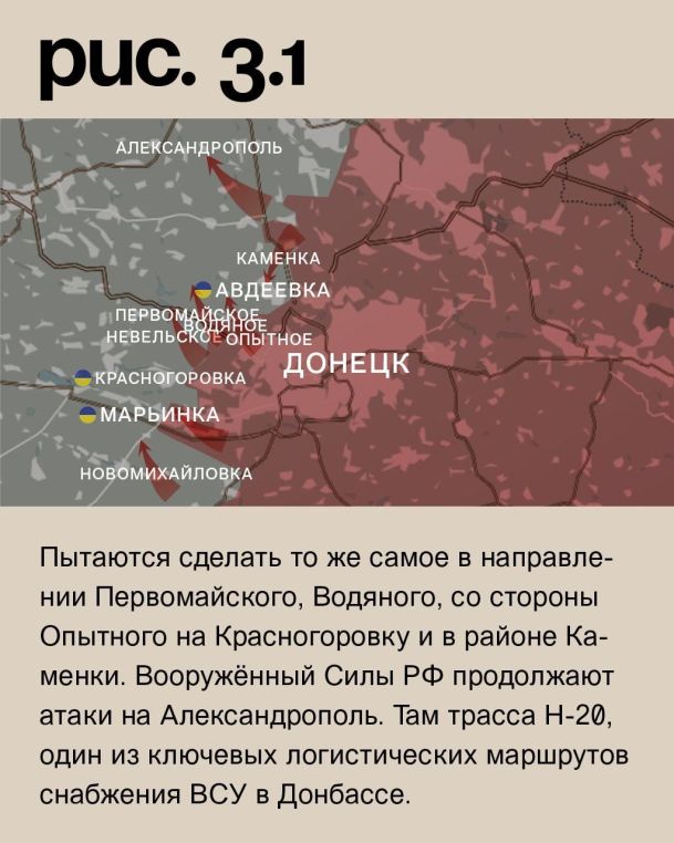 На донецком фронте российские войска вновь атакуют в районе Новомихайловки. Также ведут штурмовые действия в городской черте Марьинки. Немного продвинулись под Невельским. Пытаются сделать то же самое в направлении Первомайского, Водяного, со стороны Опытного на Красногоровку и в районе Каменки. Вооружённый Силы РФ продолжают атаки на Александрополь. Там трасса Н-20, один из ключевых логистических маршрутов снабжения ВСУ в Донбассе. (Рис. 3)