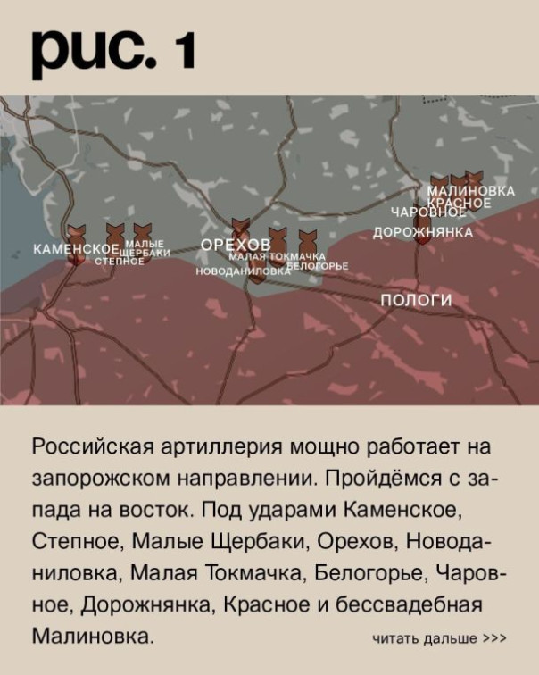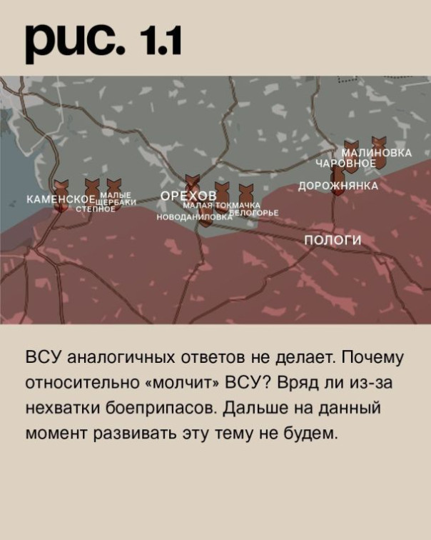 Российская артиллерия мощно работает на запорожском направлении. Пройдёмся с запада на восток. Под ударами Каменское, Степное, Малые Щербаки, Орехов, Новоданиловка, Малая Токмачка, Белогорье, Чаровное, Дорожнянка, Красное и бессвадебная Малиновка. ВСУ аналогичных ответов не делает. Почему относительно «молчит» ВСУ? Вряд ли из-за нехватки боеприпасов. Дальше на данный момент развивать эту тему не будем. (Рис. 1)