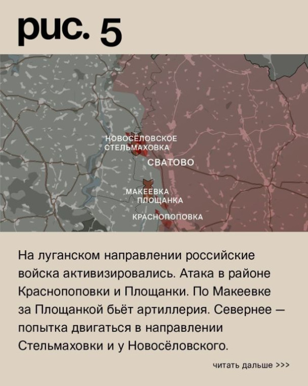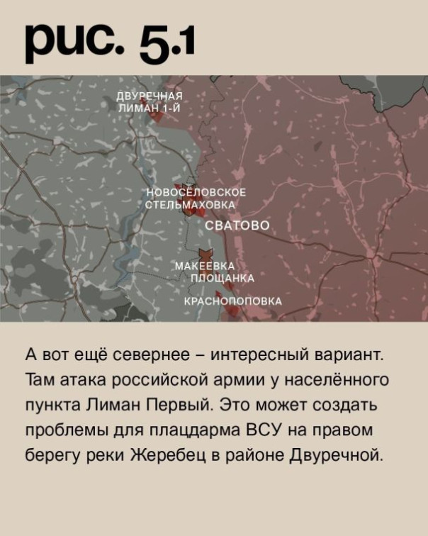 На луганском направлении российские войска активизировались. Атака в районе Краснопоповки и Площанки. По Макеевке за Площанкой бьёт артиллерия. Севернее – попытка двигаться в направлении Стельмаховки и у Новосёловского. А вот ещё севернее – интересный вариант. Там атака российской армии у населённого пункта Лиман Первый. Это может создать проблемы для плацдарма ВСУ на правом берегу реки Оскол в районе Двуречной.