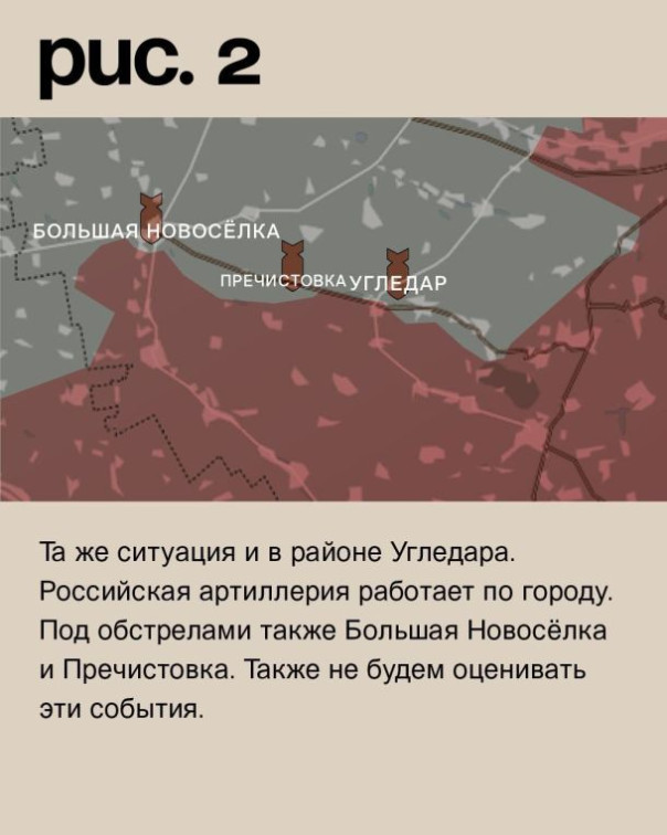 Та же ситуация и в районе Угледара. Российская артиллерия работает по городу. Под обстрелами также Большая Новосёлка и Пречистовка. Также не будем оценивать эти события. (Рис. 2)