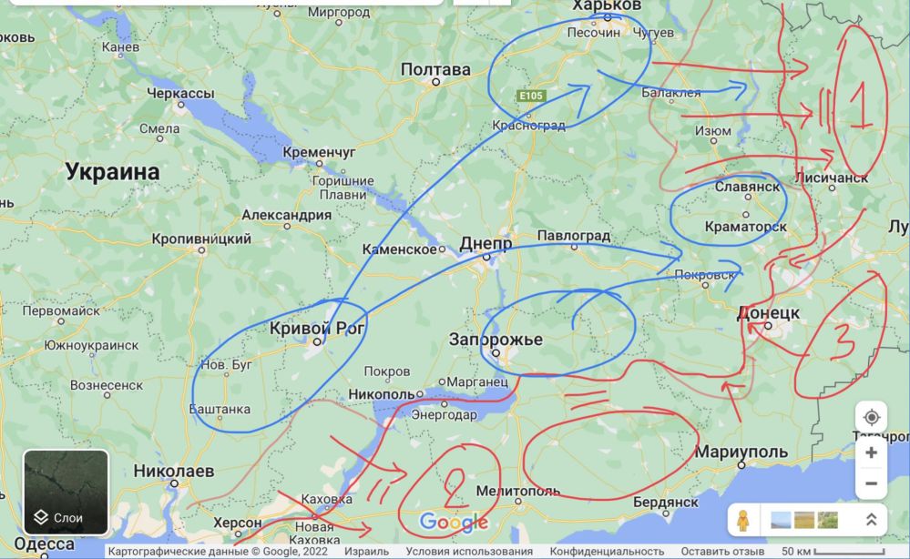 - 3. Ударить в образовавшуюся брешь из района Запорожья с целью выйти к Мелитополю и Мариуполю.