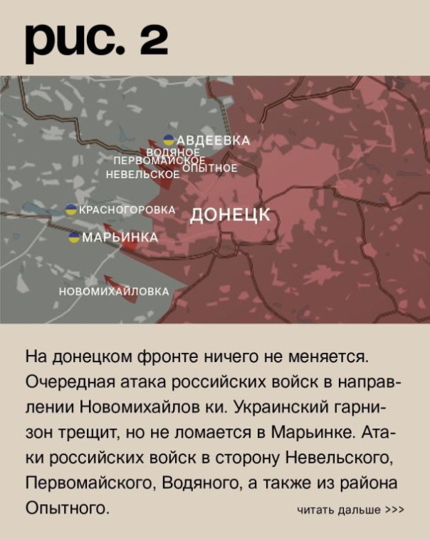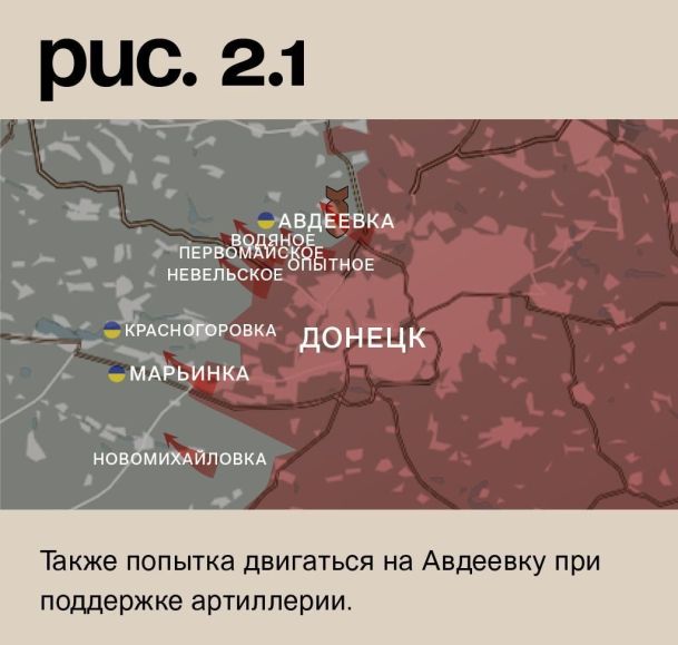 На донецком фронте ничего не меняется. Очередная атака российских войск в направлении Новомихайловского. Украинский гарнизон трещит, но не ломается в Марьинке. Атаки российских войск в сторону Невельского, Первомайского, Водяного, а также из района Опытного. Также попытка двигаться на Авдеевку при поддержке артиллерии. (Рис. 2)
