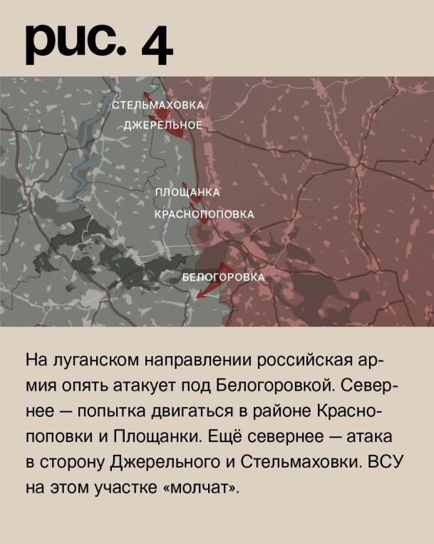 На луганском направлении российская армия опять атакует под Белогоровкой. Севернее – попытка двигаться в районе Краснопоповки и Площанки. Ещё севернее – атака в сторону Джерельного и Стельмаховки. ВСУ на этом участке «молчат».