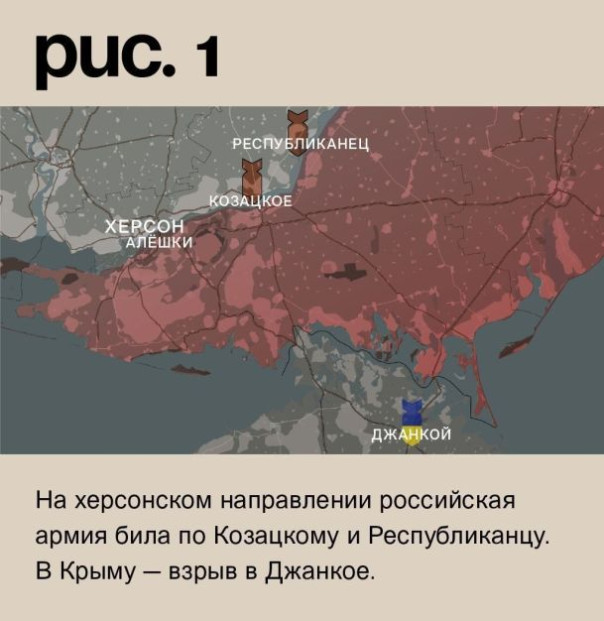 На херсонском направлении российская армия била по Лозовому, Козацкому и Горностаевке. В Крыму – взрыв в Джанкое. (Рис. 1)