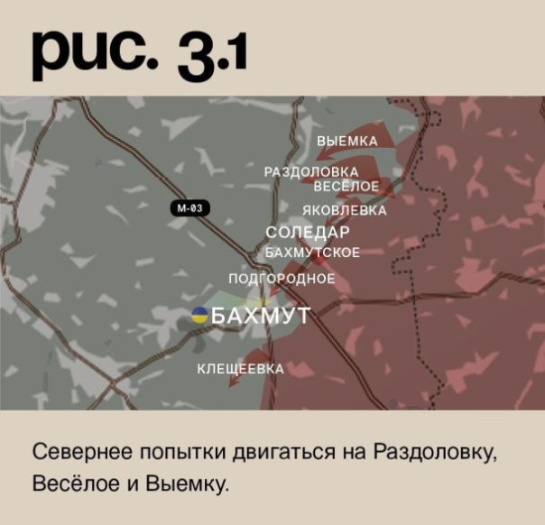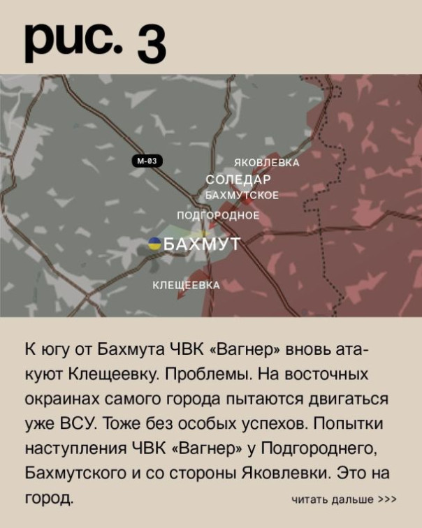 К югу от Бахмута ЧВК «Вагнер» вновь атакуют Клещеевку. Проблемы. На восточных окраинах самого города пытаются двигаться уже ВСУ. Тоже без особых успехов. Попытки наступления ЧВК «Вагнер» у Подгороднего, Бахмутского и со стороны Яковлевки. Это на город. Севернее попытки двигаться на Раздоловку, Весёлое и Выемку. (Рис. 3)