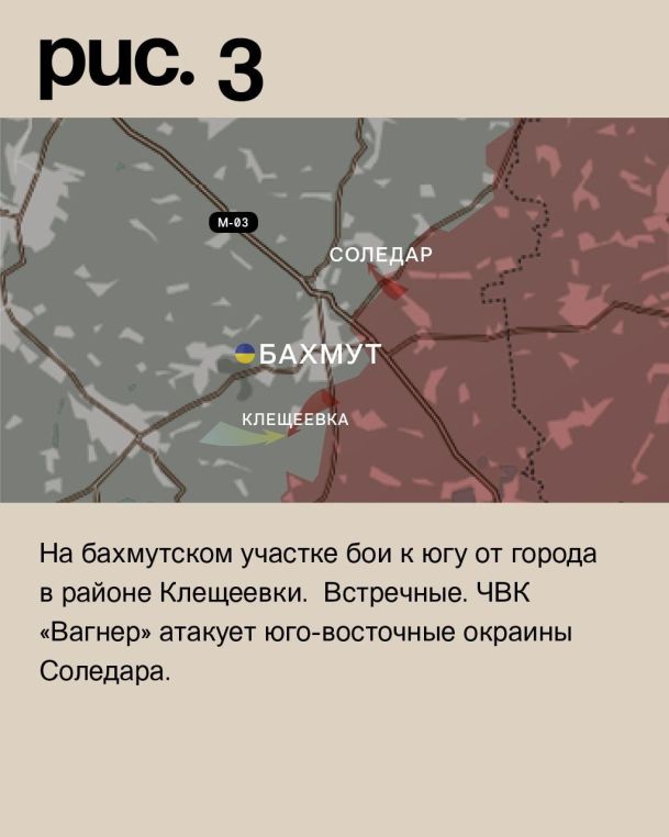 На бахмутском участке бои к югу от города в районе Клещеевки. Встречные. ЧВК «Вагнер» атакует юго-восточные окраины Соледара. (Рис. 3)