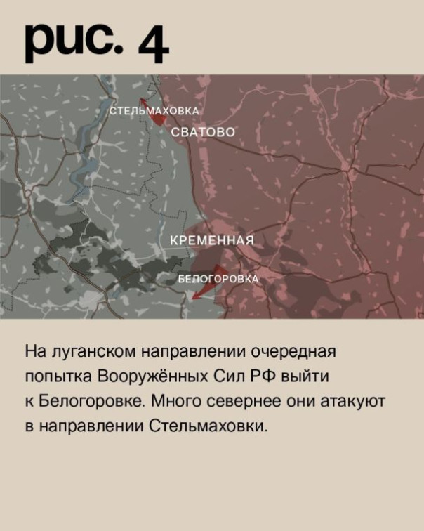 На луганском направлении очередная попытка Вооружённых Сил РФ выйти к Белогоровке. Много севернее они атакуют в направлении Стельмаховки. (Рис. 4)