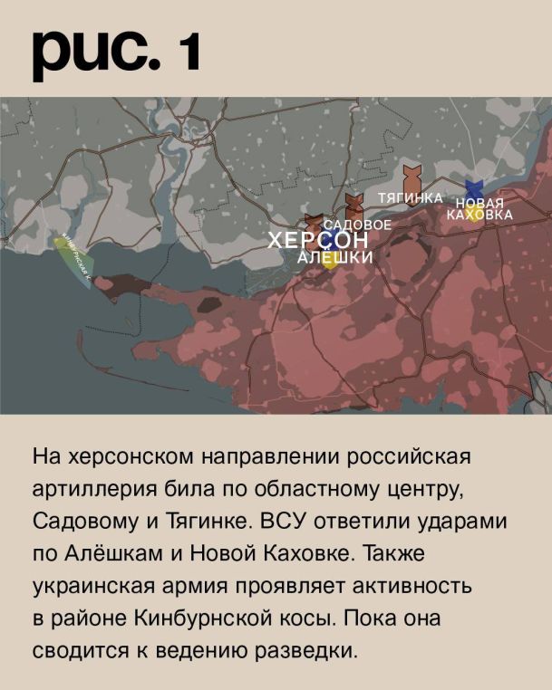 На херсонском направлении российская артиллерия била по областному центру, Садовому и Тягинке. ВСУ ответили ударами по Алёшкам и Новой Каховке. Также украинская армия проявляет активность в районе Кинбурнской косы. Пока она сводится к ведению разведки. (Рис. 1)